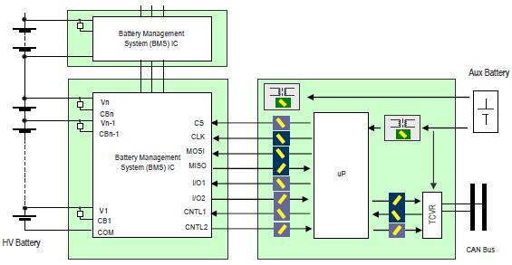 從上圖可以看出,電池高壓側(cè)的電池管理控制芯片需要配合上位機(jī)控制系統(tǒng)進(jìn)行數(shù)據(jù)傳輸和控制。 高壓側(cè)的電池管理控制芯片和上位機(jī)系統(tǒng)一般是兩個(gè)獨(dú)立的電氣控制系統(tǒng)。 它們之間的數(shù)據(jù)輸出和控制需要電氣隔離,包括各種高速數(shù)據(jù)的傳輸和其他開(kāi)關(guān)信號(hào)的傳輸。 同時(shí),電池管理系統(tǒng)BMS的信息狀態(tài)需要與車輛主控制器、電機(jī)控制器、能量控制系統(tǒng)、車輛顯示系統(tǒng)等進(jìn)行實(shí)時(shí)通信。 在電動(dòng)汽車應(yīng)用領(lǐng)域,系統(tǒng)之間的信息共享和控制往往是通過(guò)CAN總線來(lái)實(shí)現(xiàn)的,從而使汽車時(shí)刻處于安全、穩(wěn)定、可靠的狀態(tài)。