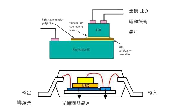 直接堆疊在硅襯底上的發(fā)光二極管(LED)芯片封裝技術(shù)可以實(shí)現(xiàn)更高的集成度和最薄的單芯片封裝。圖4顯示了兩個(gè)高速光耦 其中一條封閉通道的橫截面。輸入邏輯信號(hào)控制互補(bǔ)金屬氧化物半導(dǎo)體(CMOS)led驅(qū)動(dòng)緩沖芯片以提供led電流。光電探測(cè)器芯片由兩層透明層組成,分別是二氧化硅(SiO2)鈍化層或絕緣層和透明多晶硅?聚酰亞胺(PI)層和LED通過透明連接層粘附到光電探測(cè)器芯片。所有步驟均使用標(biāo)準(zhǔn)切屑粘附程序完成。